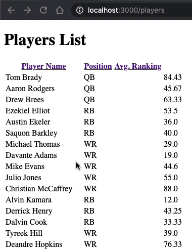 Player Name <-- Each ofthese Position is a column header Avg. Ranking <% @players.each do |player| %> <%=player.name%> <-- Each of these adds <%=player.position%> data tothe corresponding <%=player.avg_ranking%> column in the samerow <% end %>