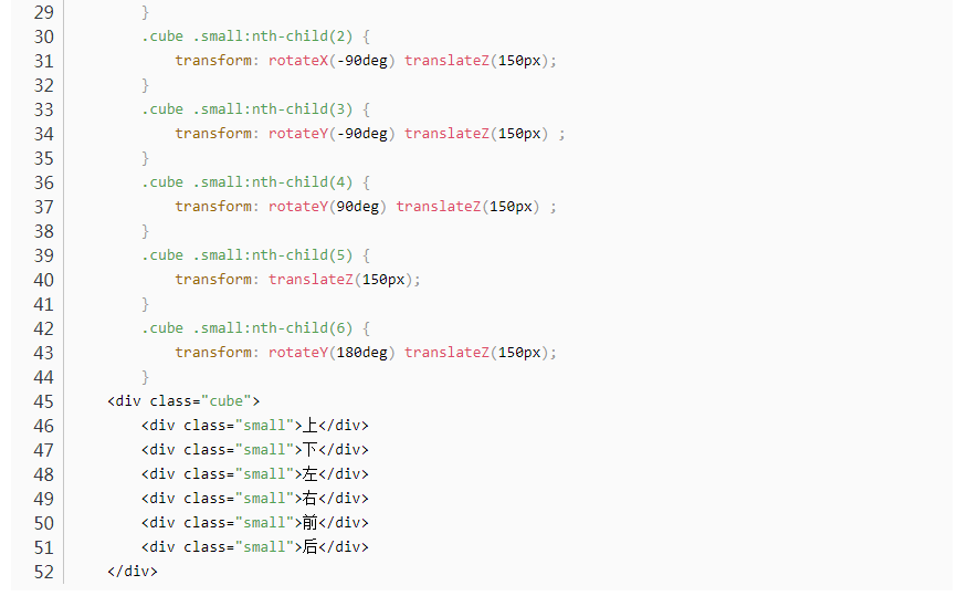首先一上下左右前后,相应个正方形得有六个相同面我们去写六个html元素.