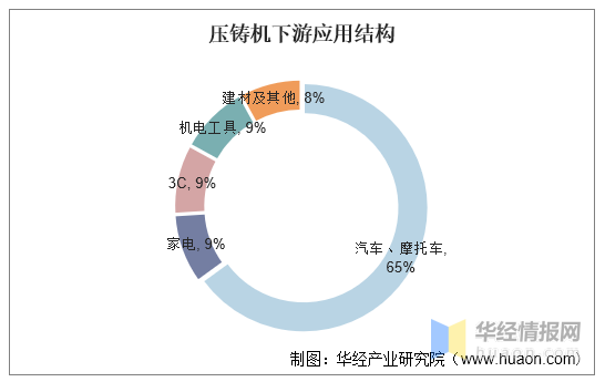 传统的压铸机主要应用于汽车(汽车动力总成配件、汽车结构件、方向盘)、摩托车、3C(计算机、通讯、消费电子)、家电、电动工具、航空航天等高科技产业。其中汽车、摩托车是最大的应用领域,占比达65%。