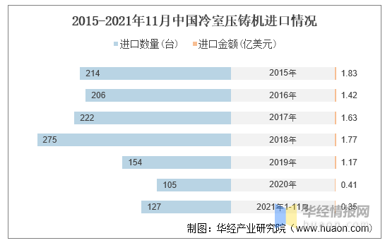 我国冷室压铸机的进口数量及金额近年来呈下滑趋势,据海关总署数据,2021年1-11月,中国冷室压铸机进口数量为127台,进口金额为0.35亿美元。