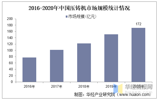 在汽车轻量化等需求的带动下,2017至2020年我国压铸机市场规模年复合增速约为20%,2020年中国压铸机市场规模约为172亿元。