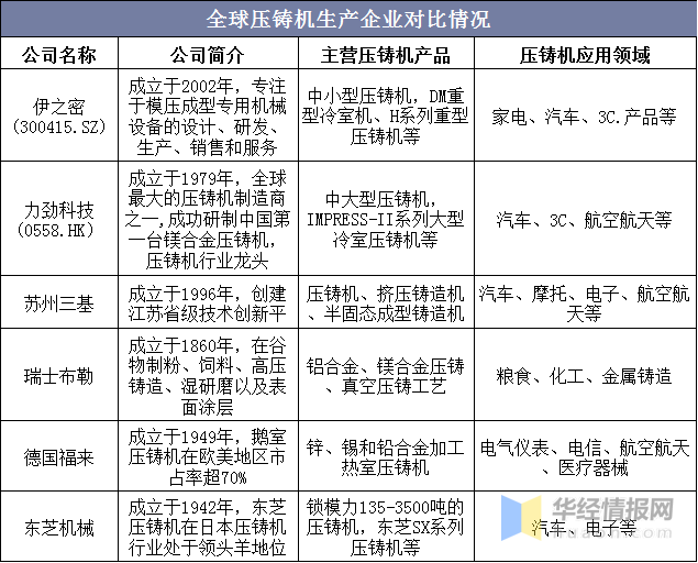 全球压铸机生产企业对比情况
