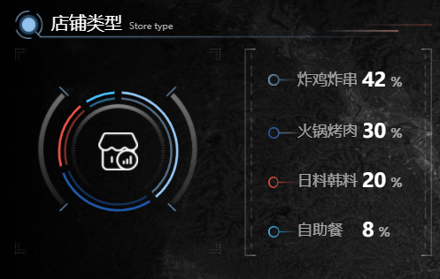 在本大屏中,“店铺类型”用环形图组件呈现,直观体现各种店铺类型的占比和差异,使得通过大屏获取大众外卖偏好这一信息更加清晰。