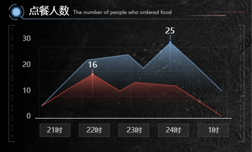 在本大屏中,选择面积图组件来呈现点餐人数,折线图体现不同时间的点餐峰值,而面积图的对比表现出不同人群点餐时区和数量的差异。