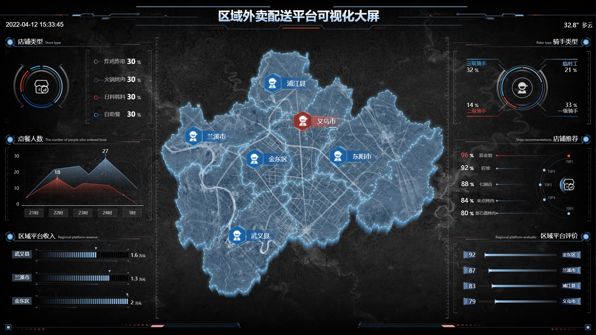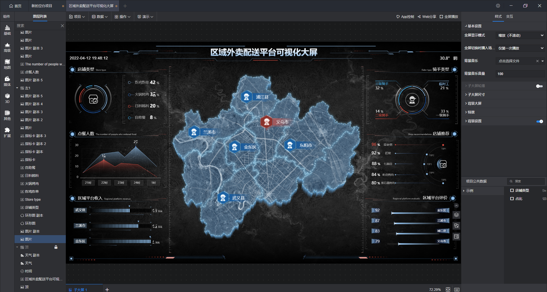 在完成组件设置后,这样一张区域外卖配送平台可视化大屏就制作完成了。