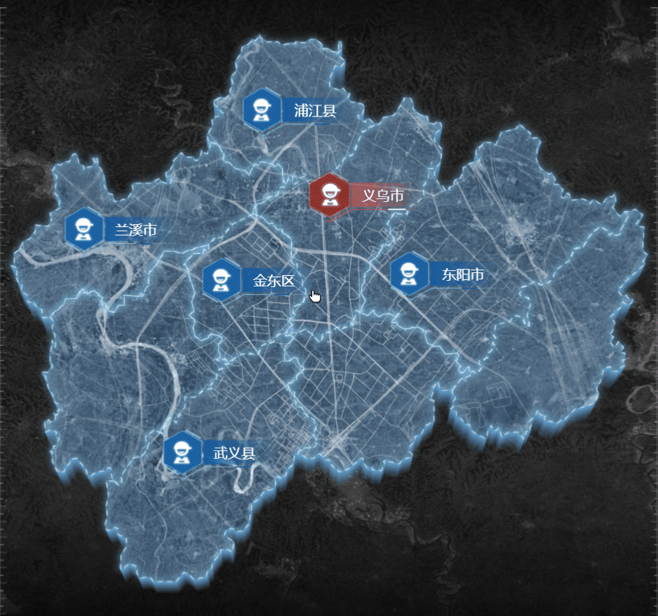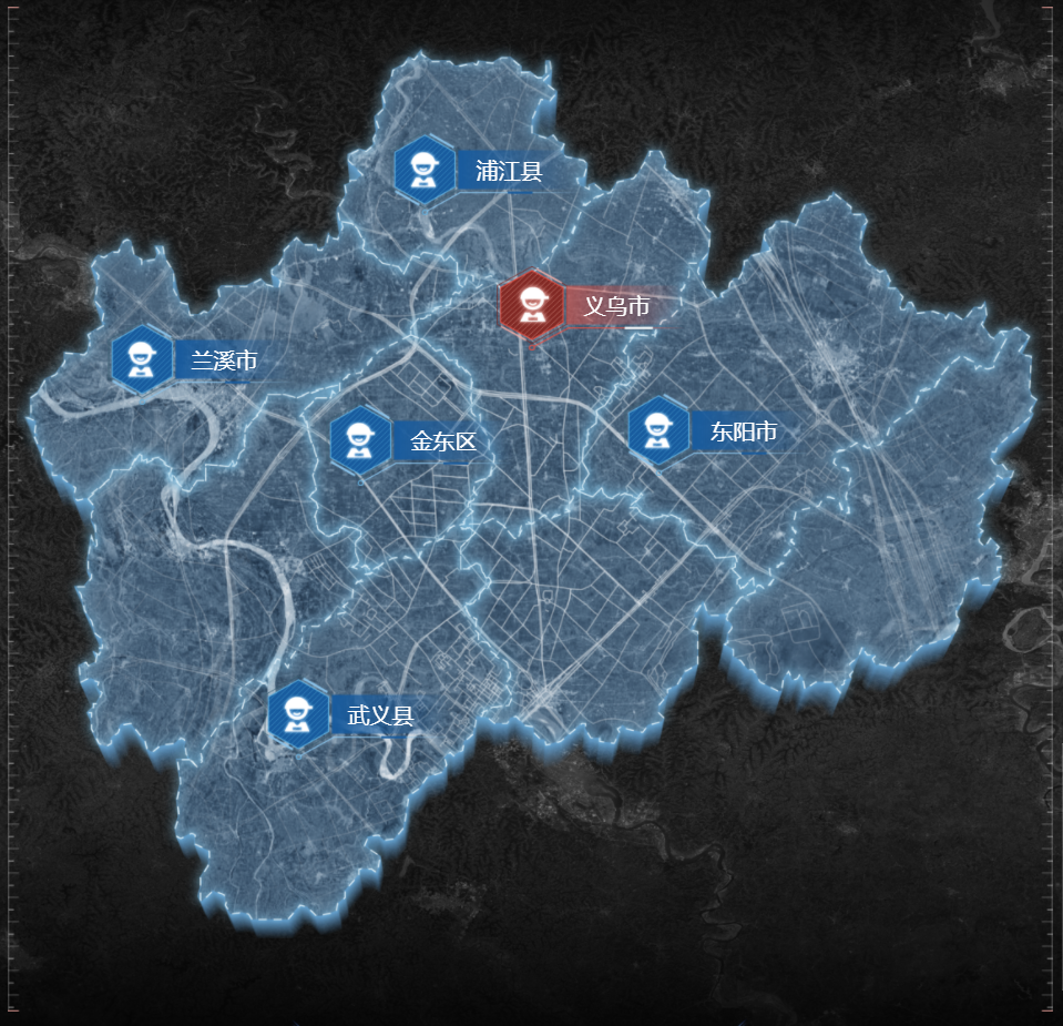 在本大屏中,以浙江省金华市部分区域为例用二维地图进行展示,加入数据支撑后将数据落实在具体的地理位置,将大屏展现的数据信息与现实位置结合起来,使数据更可信易懂。