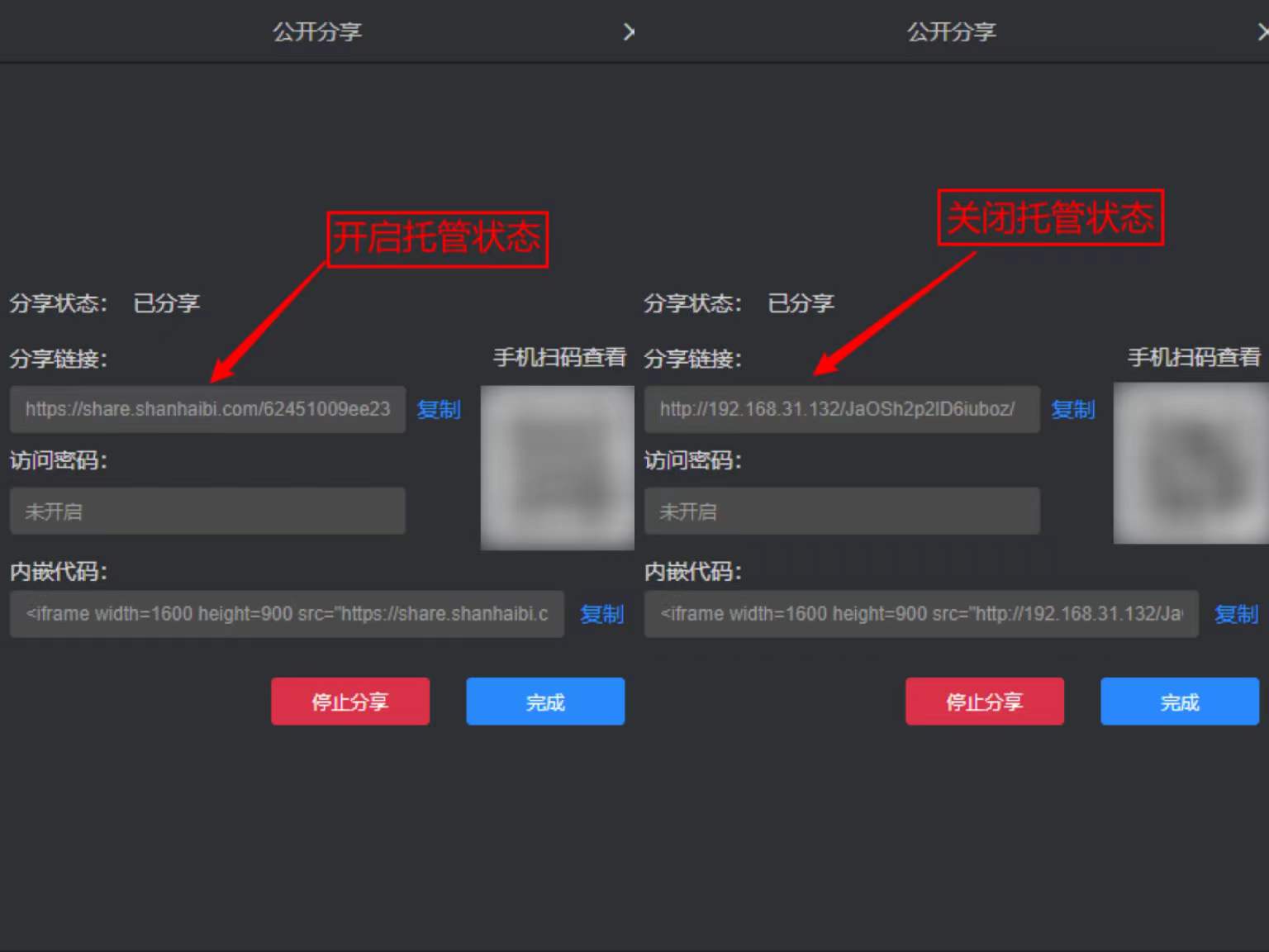 若有分享大屏的需求,也可以根据不同的分享需求建立关闭托管状态和开启托管状态两类分享链接。