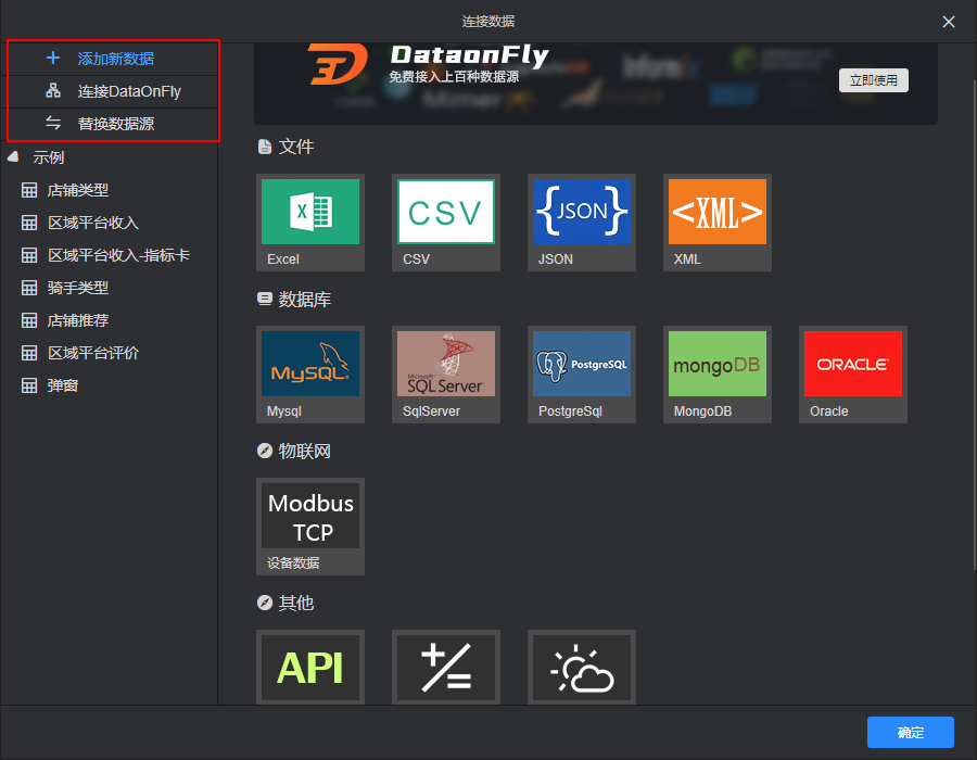 新建空白大屏可选择“添加新数据”,载入模板大屏可选择“替换数据源”,而以上两种新建大屏的方式均可以连接山海鲸数据管家(DataonFly)进行数据接入。数据导入过程可以在新建大屏后导入作为备用,也可以在所有组件设置完成后再导入。