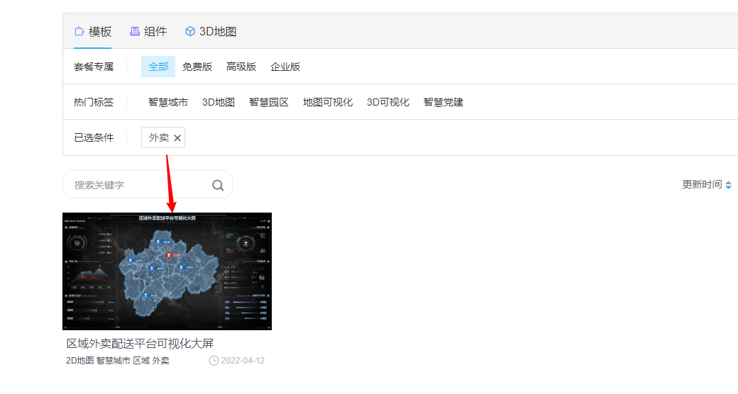 - 模板商城内进行关键词检索,载入模板大屏并替换数据进行制作。