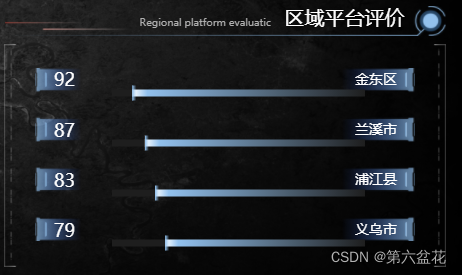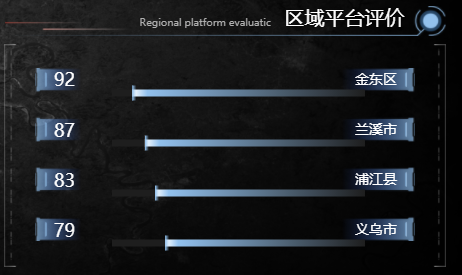 在本大屏中,区域平台评价数据用分组条形图组件呈现,条形图各项以横向对比的方式展开,数据以从大到小的方式排列,对比差异直观,数据明显易获取。