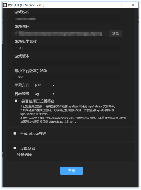 - 游戏版本名称:这个简单,测试阶段可以随意写,反正不上线谁管你,发布上线版本的话,快游戏的审核那边会审核的,如果你当前的游戏版本名称比线上版本的低,会被那边打回来的,这点需要注意。