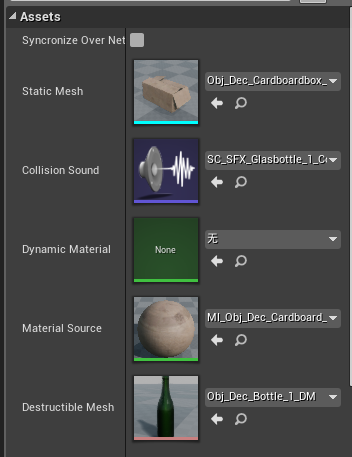 如果没有DestructibleComponent,添加一个DestructibleComponent,设置位置旋转信息,Mesh,Material,然后在对DestructibleComponent进行ApplyDamage之前先Destroy StaticMeshComponent,再让其破碎,最后销毁,销毁这里不是用的Destroy,而是SetLifeSpan