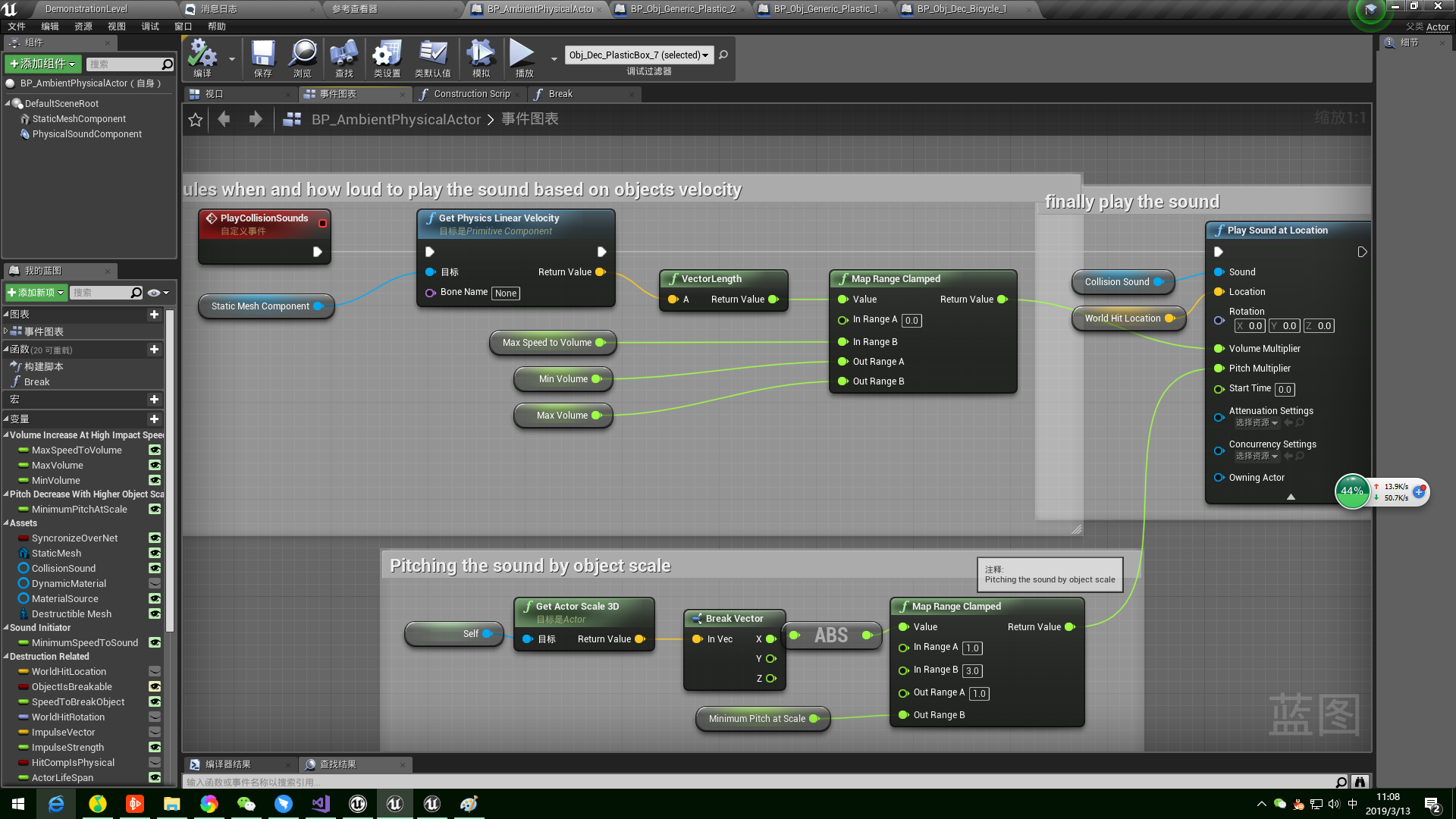 在PlayCollisionSound函数中(规定基于物体速度播放声音的时间和声音)