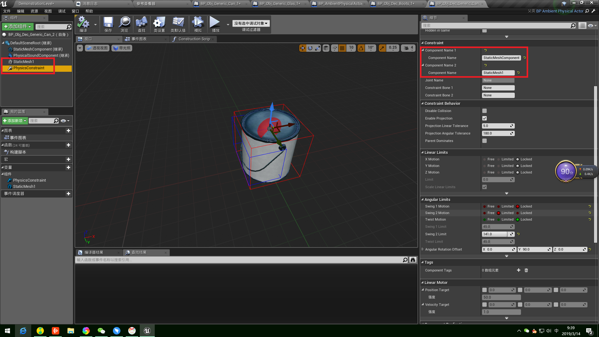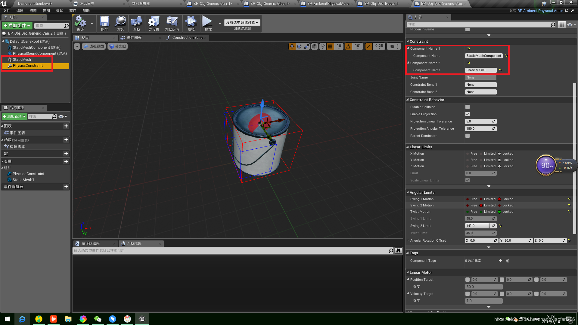 在水桶类中除了水桶mesh,还有提手的StaticMesh1,为了让提手和水桶有拉着的效果,多加了Physics Constraint Component,将水桶mesh和提手mesh束缚起来