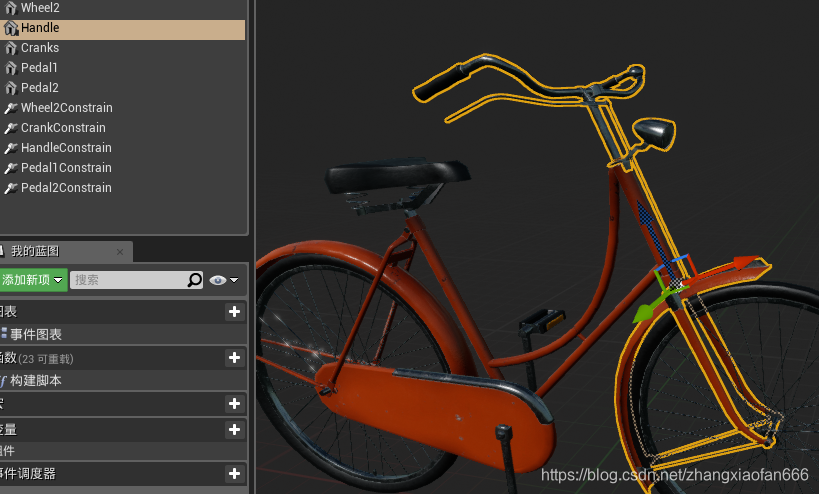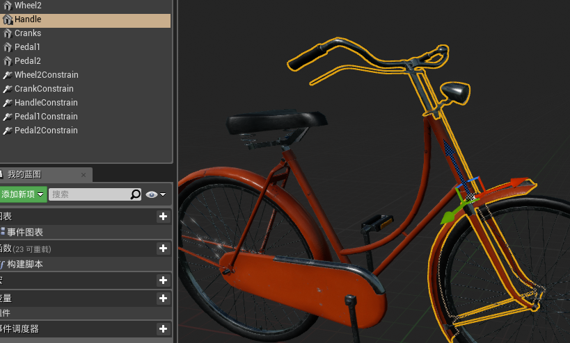 后面几个Physics Constraint Component是将两个脚踏板和铁杆相连,铁杆和车身相连,这样在游戏中才能看到车子倒地,车踏板还在车子上转动效果