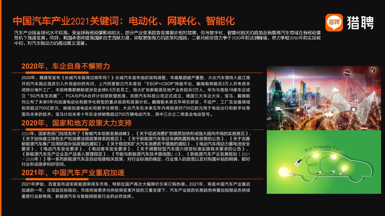 摘要:近年来数字化时代的到来促使企业进行数字化转型,而疫情让更多企业意识到了数字化转型的紧迫性,其转型进程显著加速。“十三五”期间,我国将智能网联汽车纳入国家智能制造发展重点领域,相关部委出台了多项政策支持车联网产业标准体系建设、智能网络汽车测试管理,不断推动智能网联汽车标准化工作。在推动智能网联汽车建设方面,中国走出了自己的特色。智能网联高速发展,如何留住人才成行业发展新命题。
