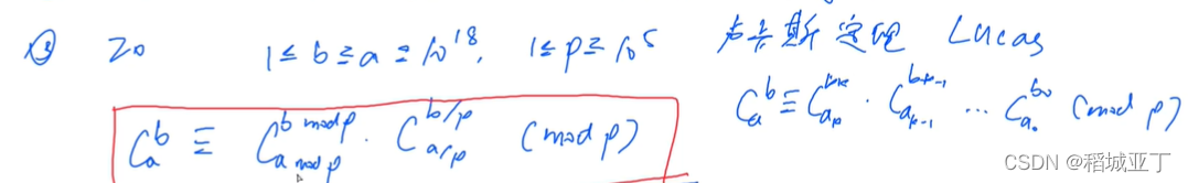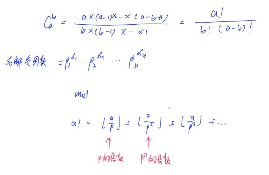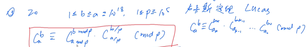 3. 20组 1<=b<=a<=10^18 1<=p<=10^5 卢卡斯定理