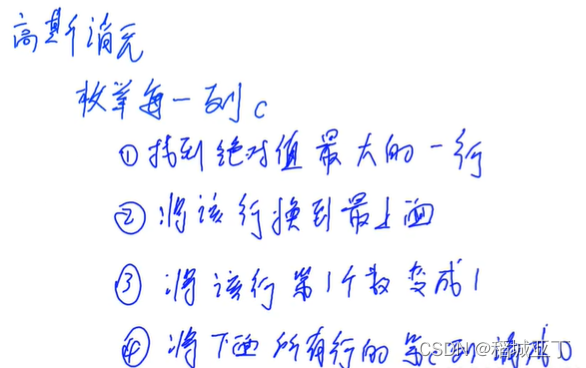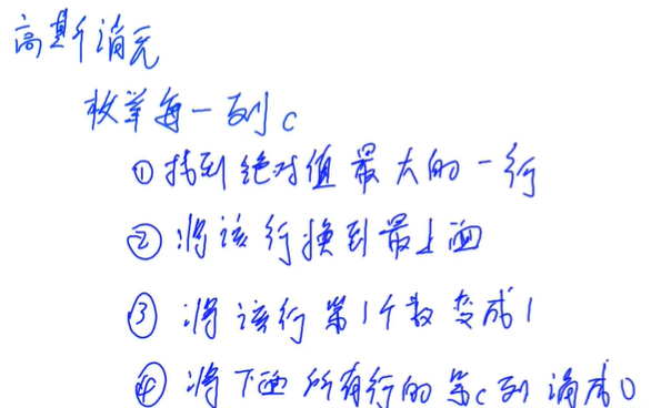 {int c,r;//c:枚举的哪一列,r:表示哪行for(c=0,r=0;cfabs(a[t][c]))t=i;if(abs(a[t][c])=c;i--) a[r][i]/=a[r][c];//把该列第一个数变成1,倒着来for(int i=r+1;ieps)for(int j=n;j>=c;j--)a[i][j]-=a[r][j]*a[i][c];r ++;}if(reps)return 2;//无解return 1;//有无穷解 }for (int i = n - 1; i >= 0; i -- )//倒着把方程消一边for (int j = i + 1; j < n; j ++ )a[i][n] -= a[j][n] * a[i][j];return 0;//有唯一解