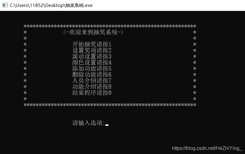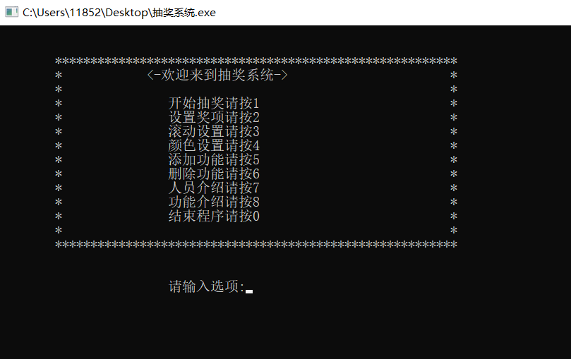 {int choose;while(1){system("cls");printf("\n\n");printf("\t*********************************************************\n");printf("\t*\t\t<-欢迎来到抽奖小程序->\t\t\t*\n");printf("\t*\t\t\t\t\t\t\t*\n");printf("\t*\t\t开始抽奖请按1\t\t\t\t*\n");printf("\t*\t\t设置奖项请按2\t\t\t\t*\n");printf("\t*\t\t滚动设置请按3\t\t\t\t*\n");printf("\t*\t\t颜色设置请按4\t\t\t\t*\n");printf("\t*\t\t添加功能请按5\t\t\t\t*\n");printf("\t*\t\t删除功能请按6\t\t\t\t*\n");printf("\t*\t\t人员介绍请按7\t\t\t\t*\n");printf("\t*\t\t功能介绍请按8\t\t\t\t*\n");printf("\t*\t\t结束程序请按0\t\t\t\t*\n");printf("\t*\t\t\t\t\t\t\t*\n");printf("\t*********************************************************\n");printf("\n\n\t\t\t请输入选项:");scanf("%d",&choose);switch(choose){case 0:return;case 1:Begin_luck();//开始抽奖break;case 2:Set_award();//设置奖项break;case 3:Set_speed();//设置滚动时间间隔break;case 4:Set_colour();//颜色设置break;case 5:Add_function();//添加功能break;case 6:Delet_function();//删除功能break;case 7:Developer();//开发人员介绍break;case 8:Function_introduction();//功能介绍break;}}