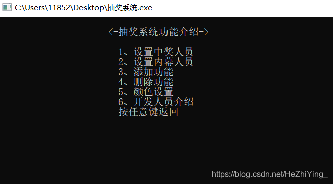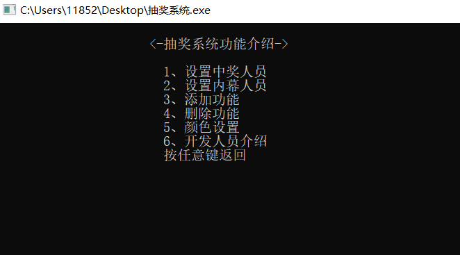 {system("cls");printf("\n\t\t\t抽奖小程序功能介绍\n");printf("\t\t\t1、设置中奖人员\n");printf("\t\t\t2、设置内幕人员\n");printf("\t\t\t3、添加功能\n");printf("\t\t\t4、删除功能\n");printf("\t\t\t5、颜色设置\n");printf("\t\t\t6、开发人员介绍\n");printf("\t\t\t按任意键返回");getch();}