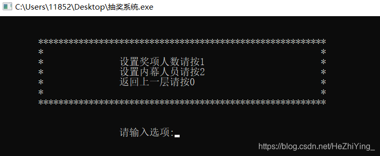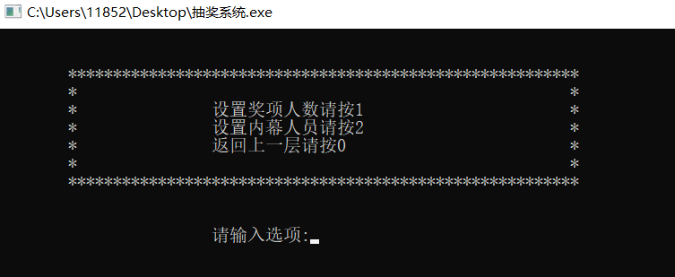 {int choose;while(1){system("cls");printf("\n\n");printf("\t*********************************************************\n");printf("\t*\t\t\t\t\t\t\t*\n");printf("\t*\t\t设置奖项人数请按1\t\t\t*\n");printf("\t*\t\t设置内幕人员请按2\t\t\t*\n");printf("\t*\t\t返回上一层请按0\t\t\t\t*\n");printf("\t*\t\t\t\t\t\t\t*\n");printf("\t*********************************************************\n");printf("\n\n\t\t\t请输入选项:");scanf("%d",&choose);switch(choose){case 0:return;case 1:Set_awards();//设置奖项人数break;case 2:Set_grade();//设置内幕人员break;}}
