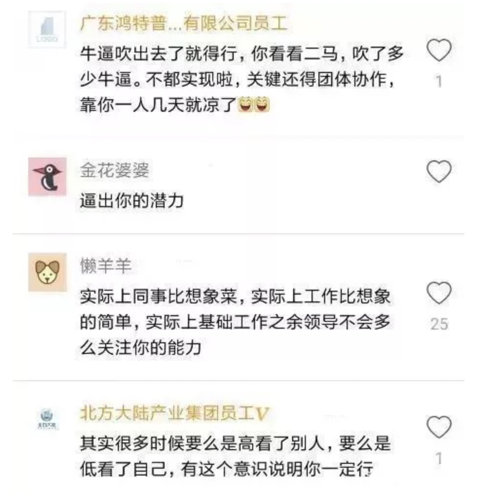 有网友认为:内心想法有时并不能代表现实的情况,公司一般是依靠团体协助而不是个人行动,而你既然被认同但自己觉得不行,有很大部分原因可能是自己超常发挥了,毕竟面试官也不是傻子,怎么可能聘请个没用的人来呢?所以现在想想是不是没那么不自信了呢?
