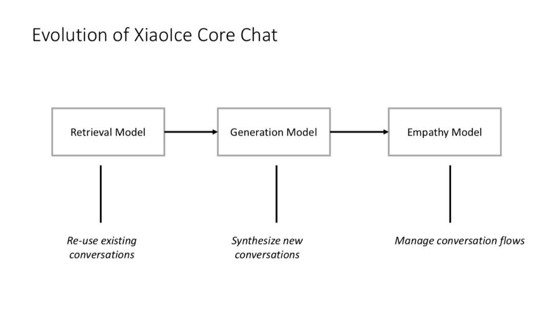 在三种能力之上,结合检索模型(Retrieval Model)、生成模型(Generation Model)和共感模型(Empathy Model),这样小冰就可以自主把握对话过程。