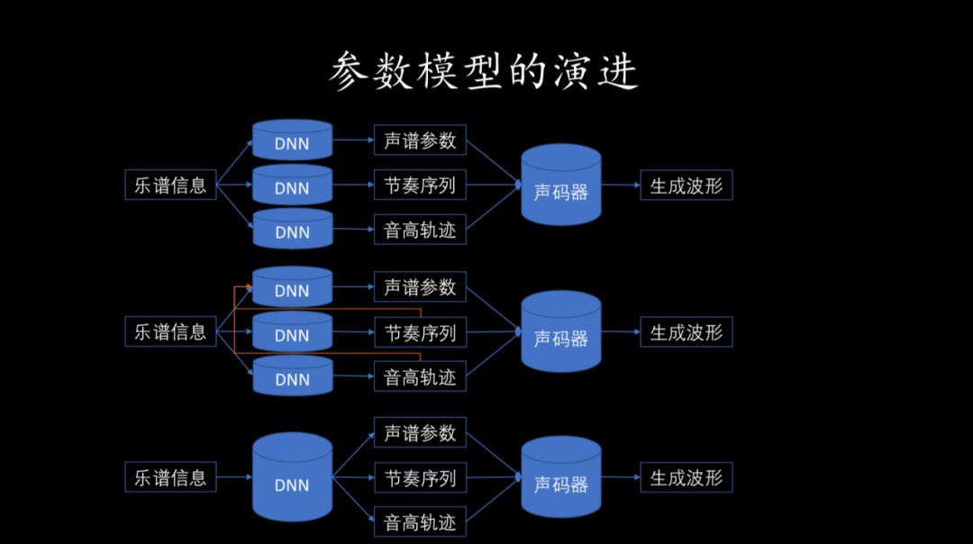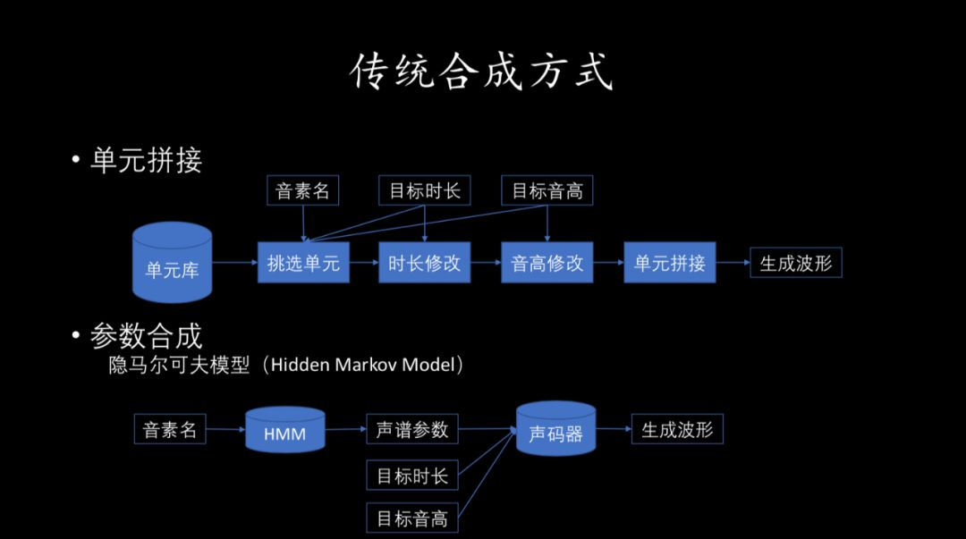 这种方法是从大量录音数据中提取包括能量谱、时长、音高在内的声学参数,通过声学参数、声码器把音频的波形重构出来。