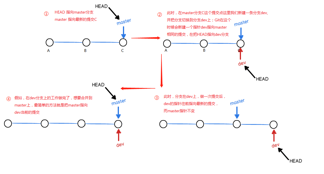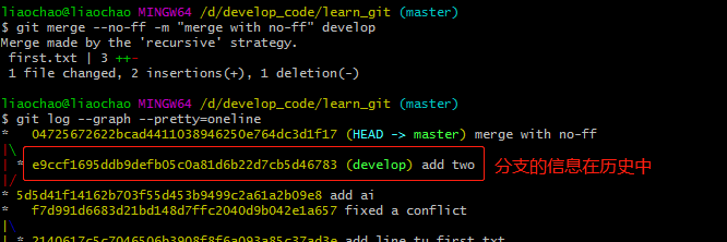 3.11.3、 需要了解一点,合并分支时,Git默认会使用Fast forward 模式(比如在master上:git merge dev:就是将master的指针指向dev分支的最新提交,再把HEAD指向master),但是这种模式下,如果删除分支,会丢掉分支信息(commit id 这些),这个可以从日志看出来: