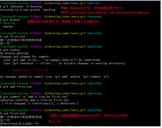 3.11.2、可是事实上,我们不会一直这么顺利,Git有一个合并冲突的概念; 假如,如果是这样一种情况,我在develop分支上,在first.txt这个文件中加了一行: