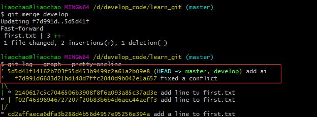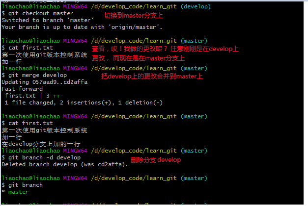 在develop分支上做完了修改后,切换回master分支,并把修改合并到master分支上来: