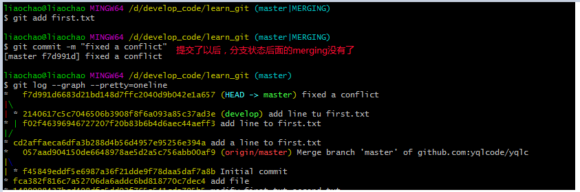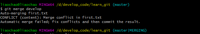 然后在master分支上合并develop分支中修改的内容; 可以看到,合并发生了冲突,合并失败,此时就需要我们手动解决冲突,然后在提交文件, 并且此时分支的状态是merging。