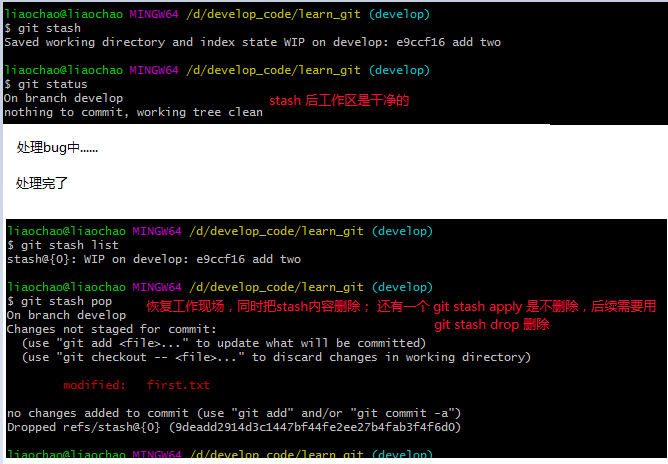 3.11.4、 有一种情况: 我在一个分支比如develop上正在愉快的写着我的代码, 突然,项目经理说: XXX,这个有一个bug需要你马上修复一下,此时我们不得不暂时停下手中的工作去改bug,但是等等,我写到一半的代码怎么办,也没法提交啊; 此时,Git提供了一个stash功能,把当前的工作现场储存起来,修改完bug后我们再取回刚刚的工作现场,完美 ^_^: