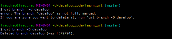 3.11.5、 没有被合并过的分支不能普通删除,如果确切要删除,可以使用强制删除
