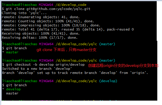 假如现在项目组新入职了一位小伙伴,它从远程库中拉取了代码分支master,但是平时开发都是在develop分支上的, 此时他需要先创建远程origin的develop分支到本地: