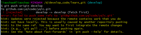 2、如果推送失败,则因为远程分支比你的本地更新,需要先用git pull试图合并;