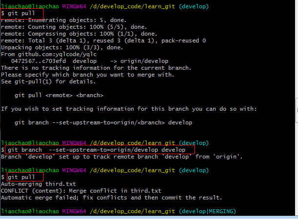 上图中,先做git pull 操作,提示我们没有建立本地develop分支到远程origin/develop分支的连接,提示我们用 git branch --set-upstream-to=origin/
