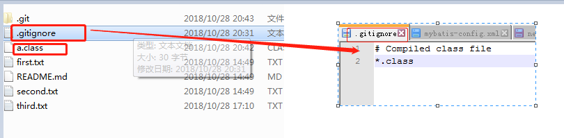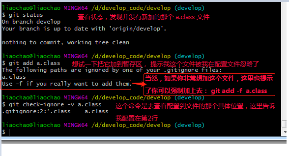 我在Git工作区创建了 .gitignore 文件, 并在其中配置了 *.class (意识是忽略所有class文件), 将它push到远程库以后, 再在工作区新建了一个 a.class 文件