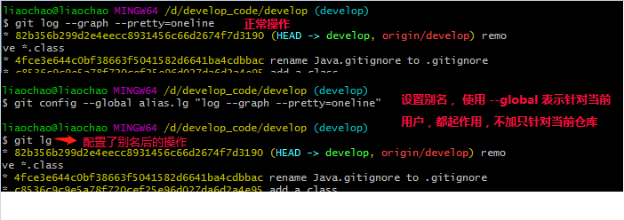 比如我们经常使用的查看历史记录的命令, git log ...balabala 后面一大堆,那么可以用别名呀: