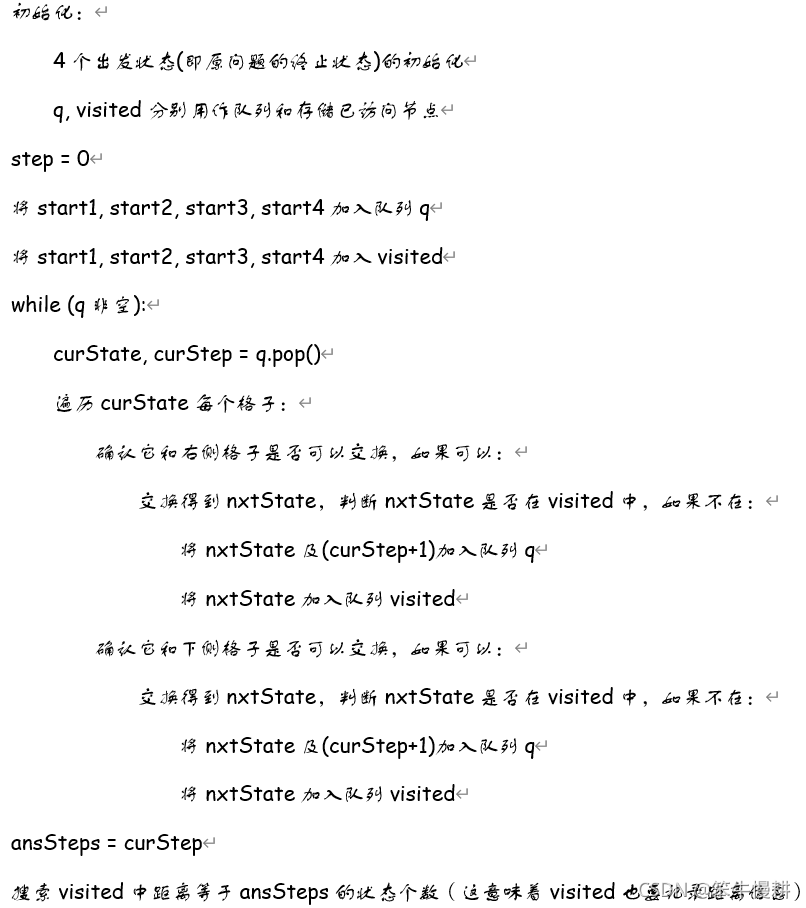 如以上算法流程图中所述,由于最后需要最终层的所有状态个数,因此visited以字典的方式记录状态以及其对应的距离。