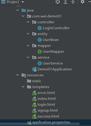 public class LoginController {//将Service注入Web层@ResourceUserService userService;//实现登录@RequestMapping("/login")public String show(){return "login";}@RequestMapping(value = "/loginIn",method = RequestMethod.POST)public String login(String name,String password){UserBean userBean = userService.LoginIn(name, password);log.info("name:{}",name);log.info("password:{}",password);if(userBean!=null){return "success";}else {return "error";}}@RequestMapping("/signup")public String disp(){return "signup";}//实现注册功能@RequestMapping(value = "/register",method = RequestMethod.POST)public String signUp(String name,String password){userService.Insert(name, password);return "success";}