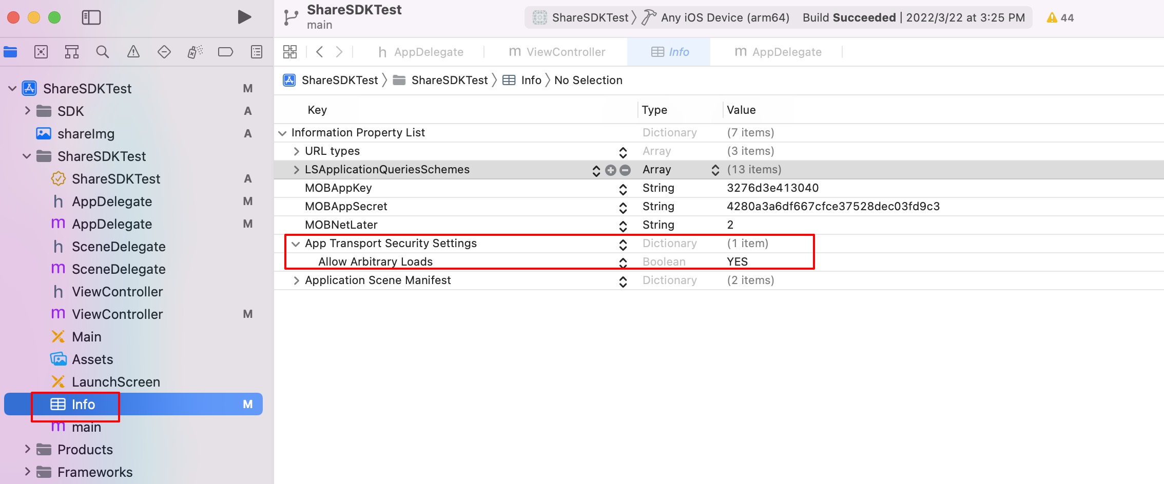 在项目默认的plist文件里 配置ShareSDK的AppKey和AppSecret,键分别为 MOBAppKey 和 MOBAppSecret ,值为之前在MobTech官网开发者后台申请的AppKey和AppSecret( 注意配置之后保存好,然后看项目的Info选项里有没有 )