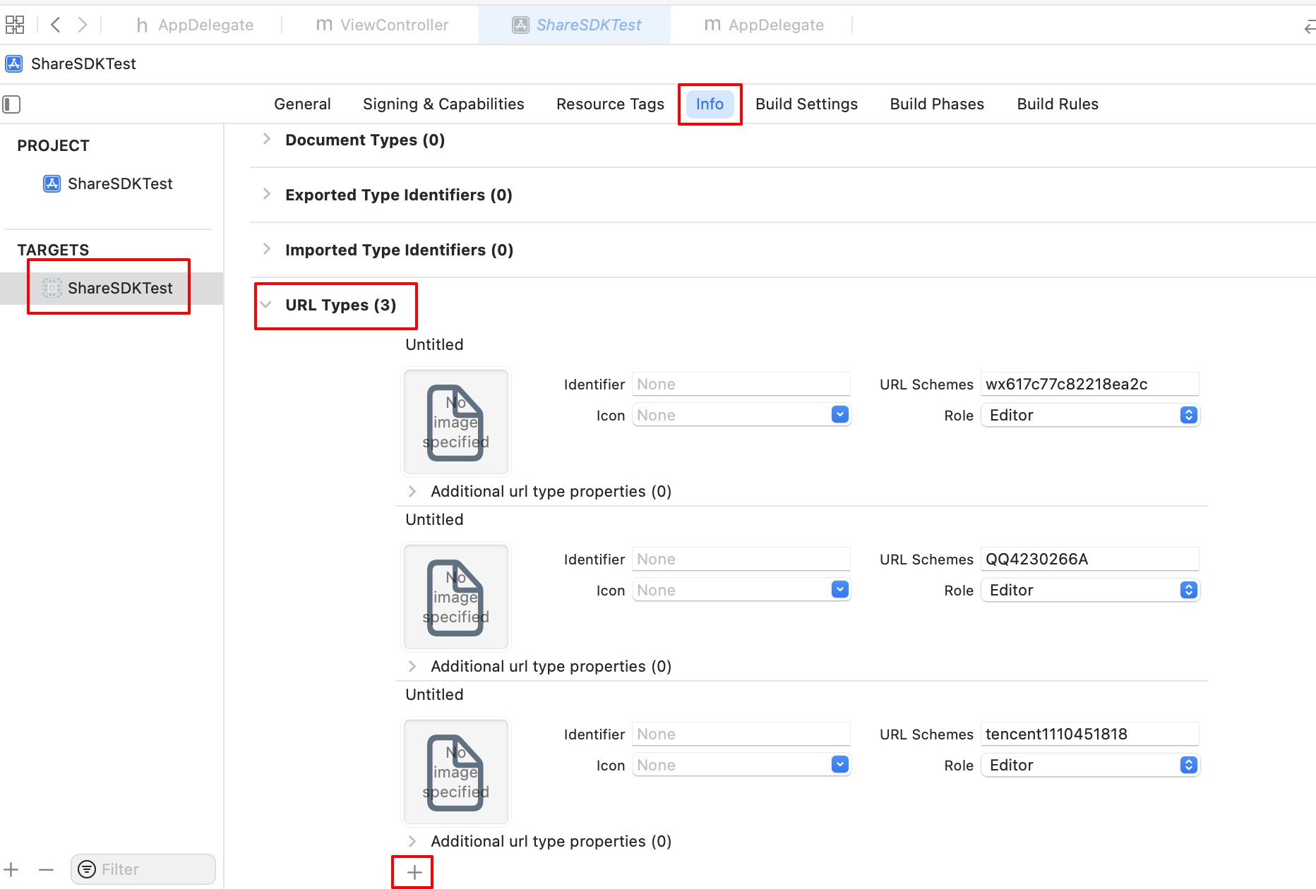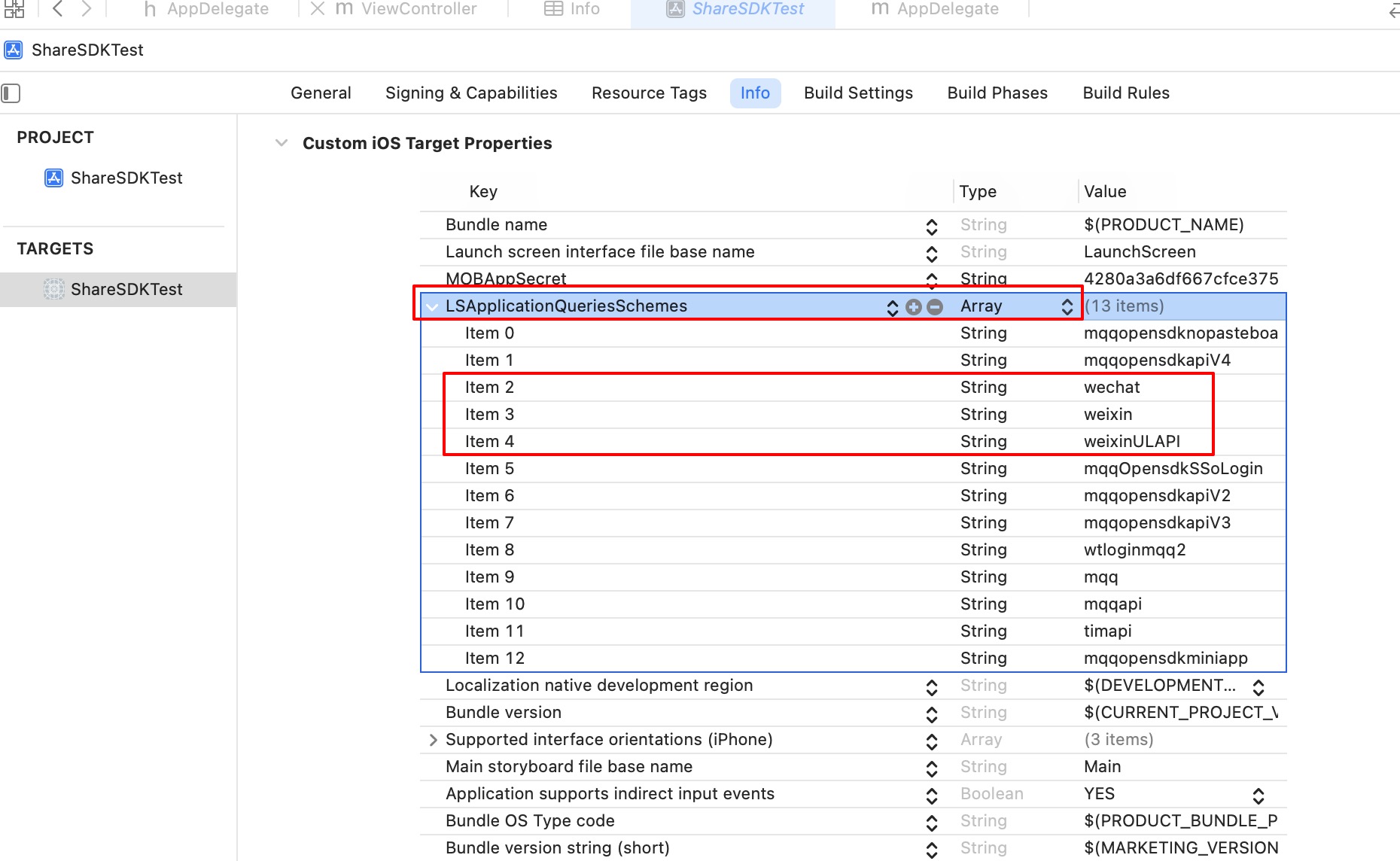 打开项目Info选项,找到URL Types,添加微信的URL Scheme:初始化里的AppId就是URL SCheme,如下图: