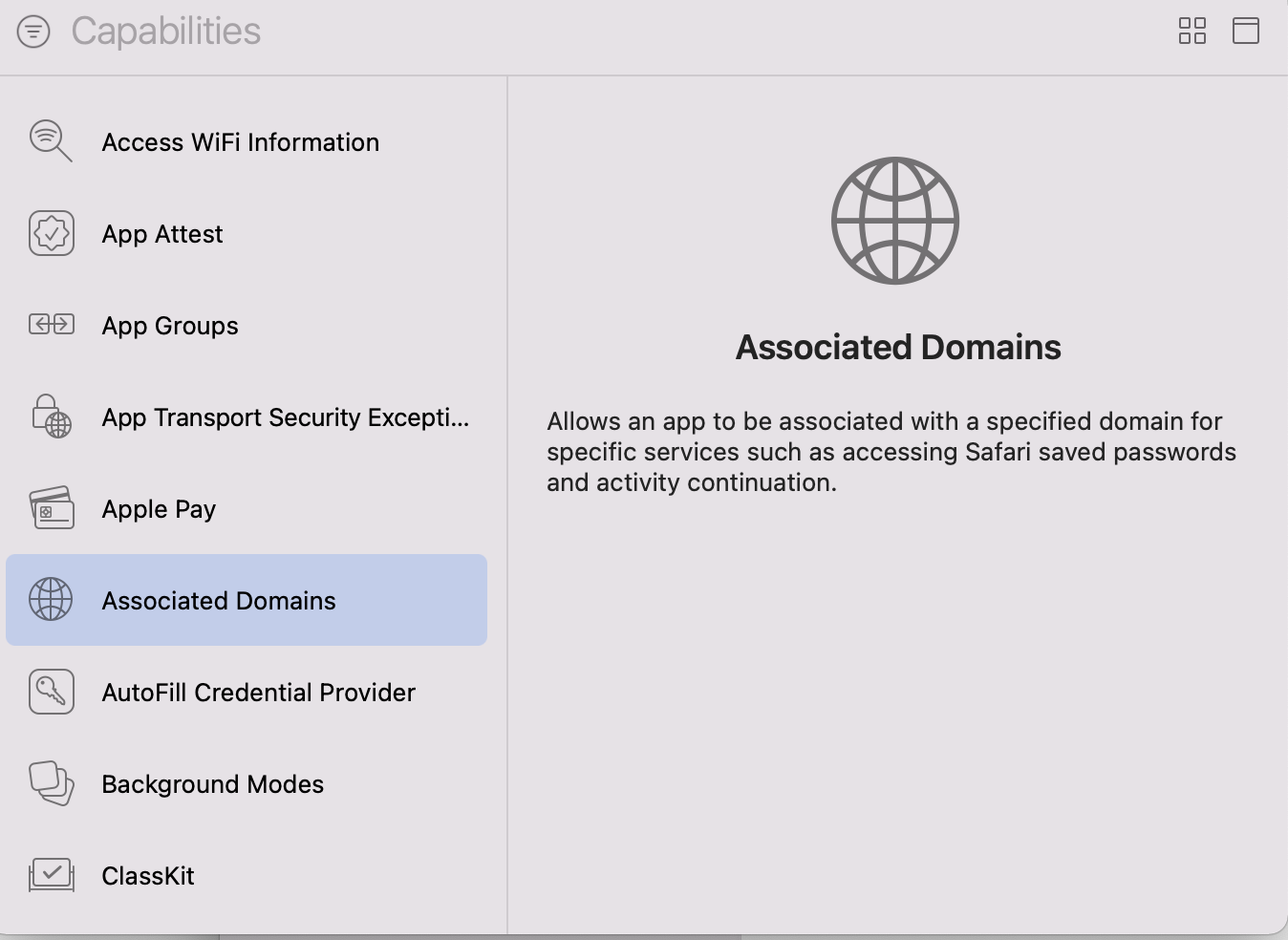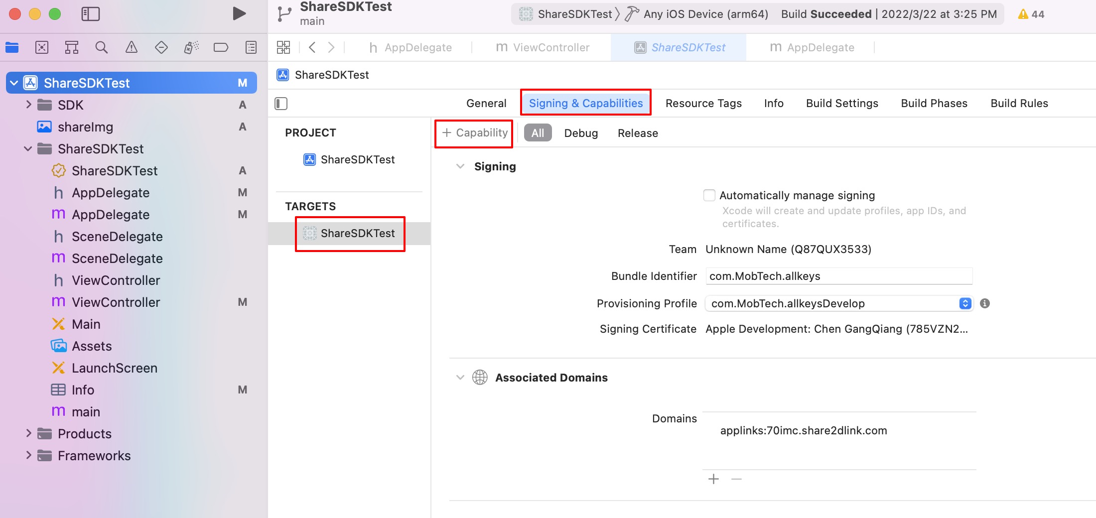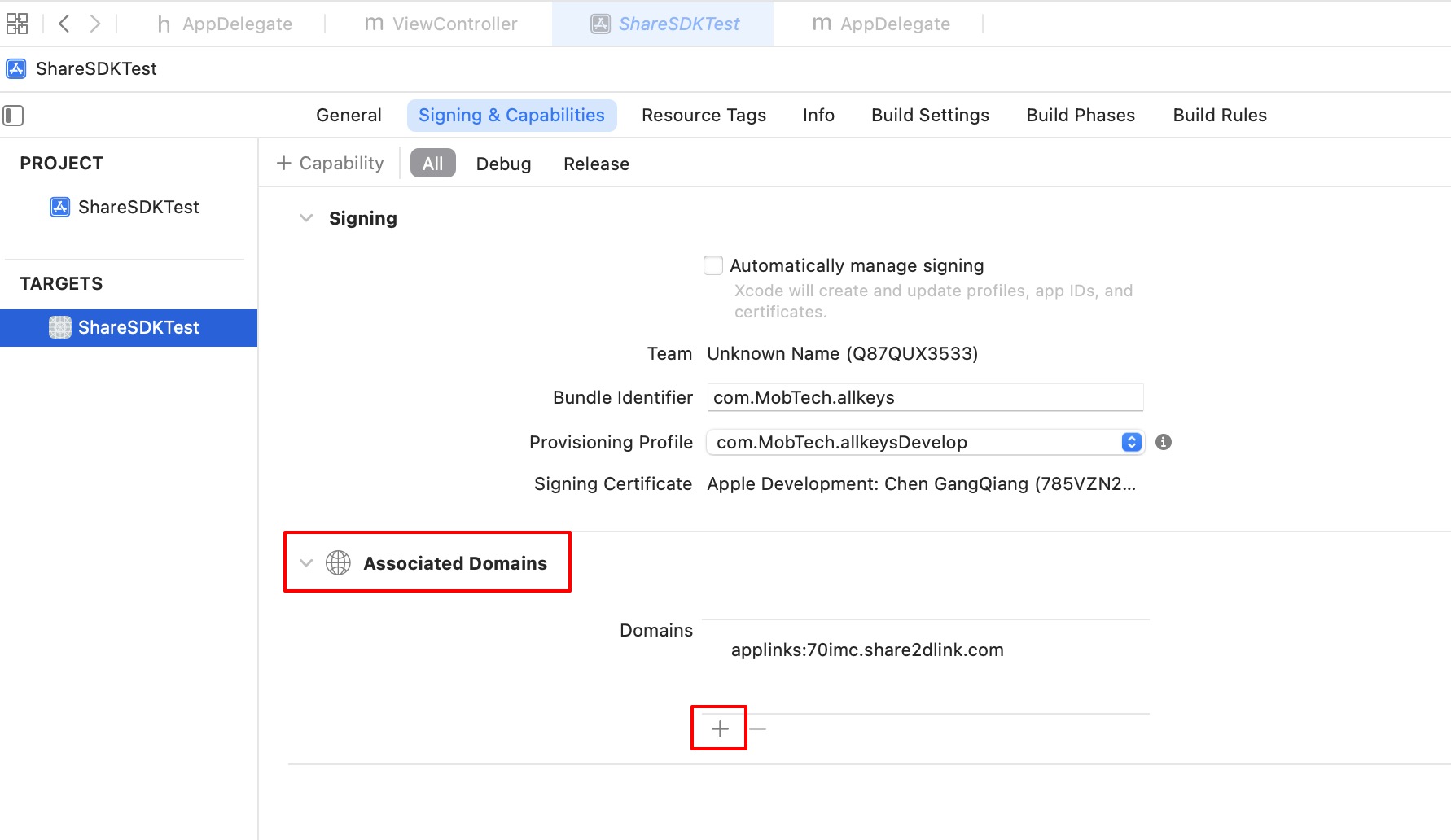 添加Associated Domains(注意:证书必须开通这个功能哦)