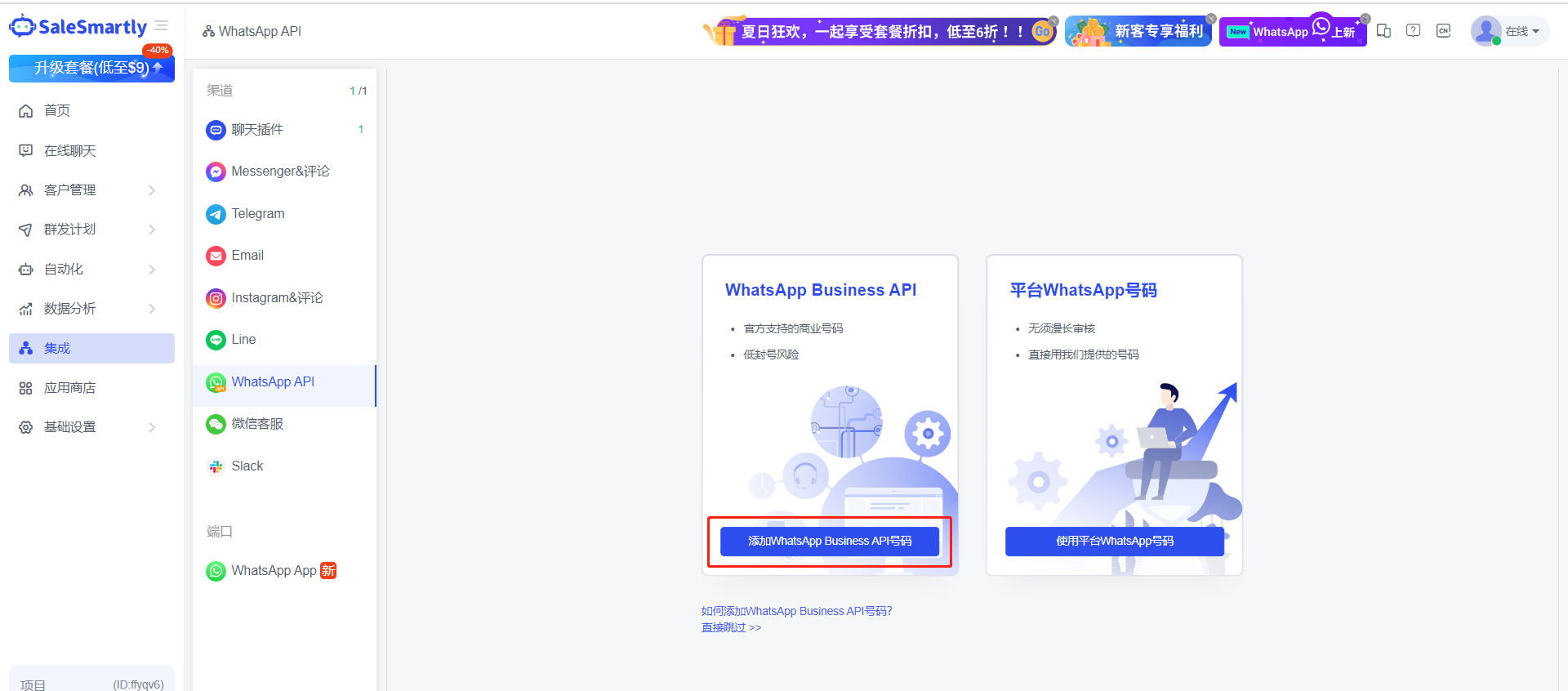 小S推荐用SaleSmartly(SS客服),它提供了两种方式集成WhatsApp号码: