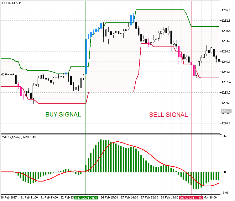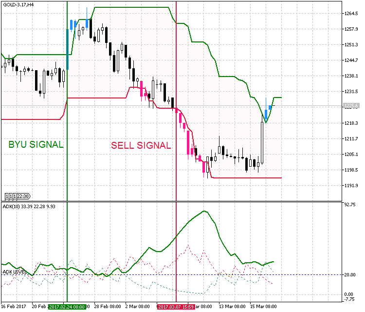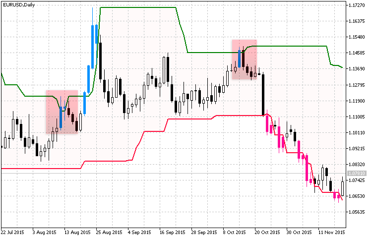 我不会重新发明车轮, 也不会再创建此指标的另一个程序。我决定使用其 Donchian 通道系统 改编版, 它完美地体现了基于此系统的交易风格。在图例.1 中, 粉红色和蓝色的蜡烛条显示了通道边界被突破的区域, 在此位置预计入场。