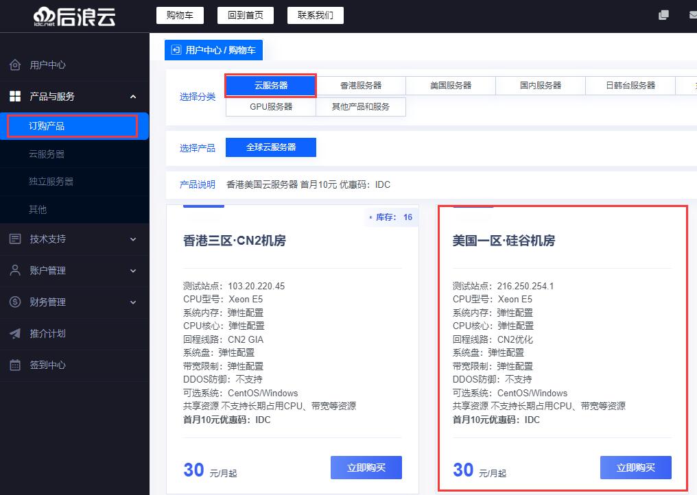 首先进入后浪云的用户中心(如果是新用户,需要先注册并进行实名认证),在左侧菜单栏点击产品与服务,在下拉列表中点击订购产品,进入产品选购页面。我们在页面中找到美国一区·硅谷机房,并点击立即购买,进入产品配置页面。
