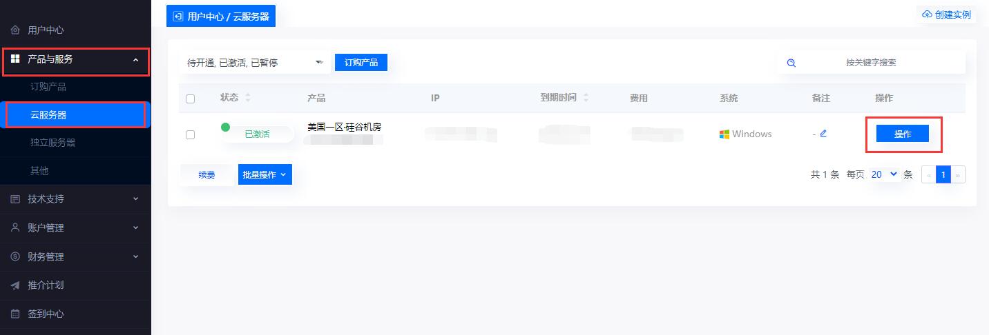 开通完成后,我们在用户中心左侧菜单栏点击产品与服务,在下拉列表中点击云服务器,进入云服务器列表页面,找到对应云服务器,点击操作按钮,进入云服务器管理页面。在页面中我们可以查看云服务器的远程登录信息,包括云服务器的IP、用户名、密码和端口(默认是3389)。