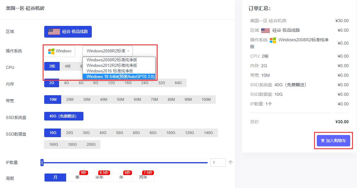 在产品配置页面,可以选择你需要的CPU、内存、带宽、数据盘、IP等配置,我们也需要在这个页面选择操作系统。我们在这里选择Windows系统(默认),并选择其中的:Windows 10 64bit(预装AutoGPT0.3.0)。选完操作系统、配置、周期后,加入购物车,并完成支付,一台预装AutoGPT0.3.0的美国服务器即开通完成。
