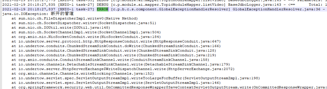 在这里面的文章里找到一些有用的内容,原来是因为接口响应过慢,导致前端那边设置的超时时间到了,直接主动切断了与后端的连接,但是后端还在查数据,查完以后想返给前端,发现管道已经断掉了,就只好报这个错误的